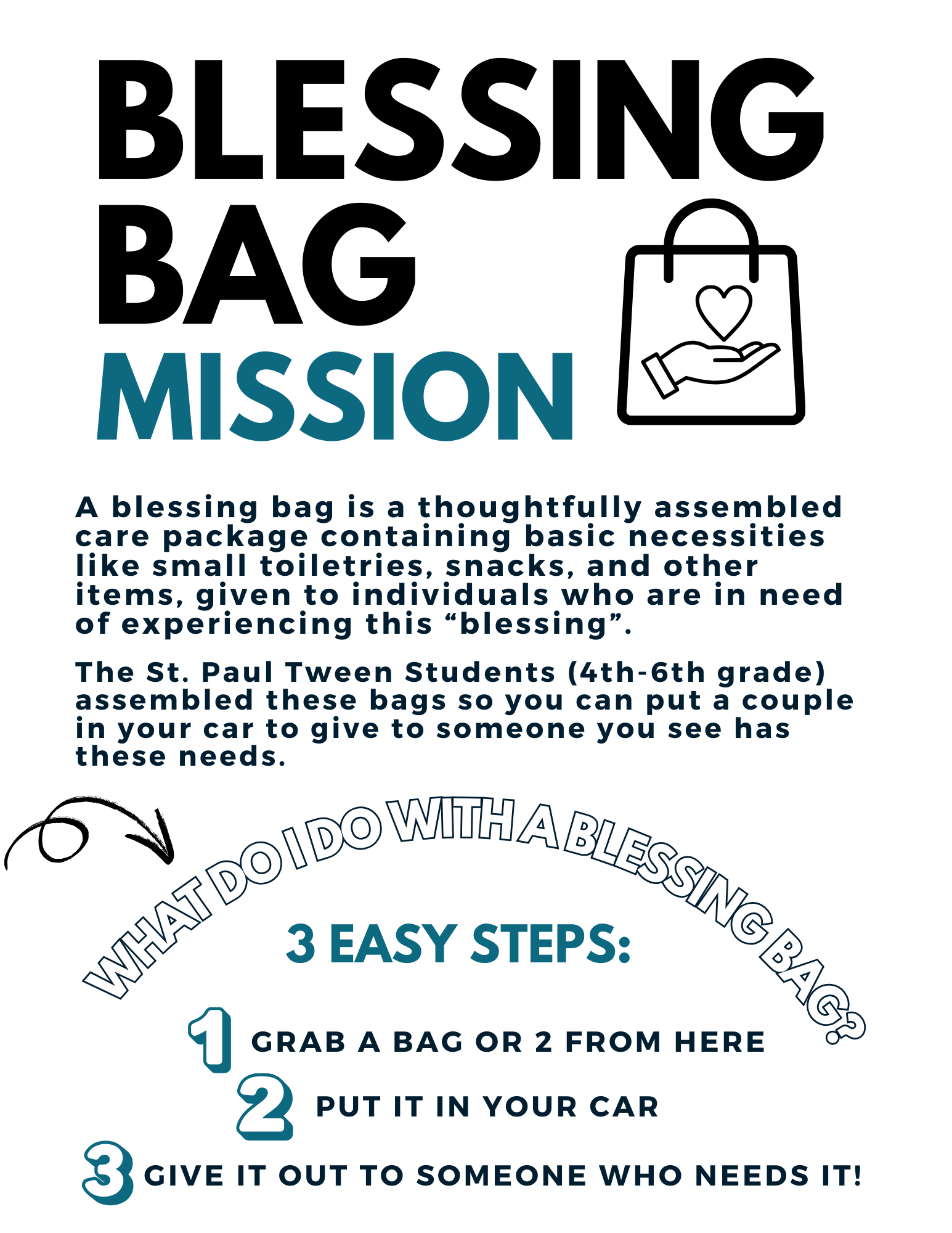 Every year, the St. Paul Tween’s Student’s (4th-6th grades) assemble these bags so you can put a couple in your car to give to someone you see that has these needs.