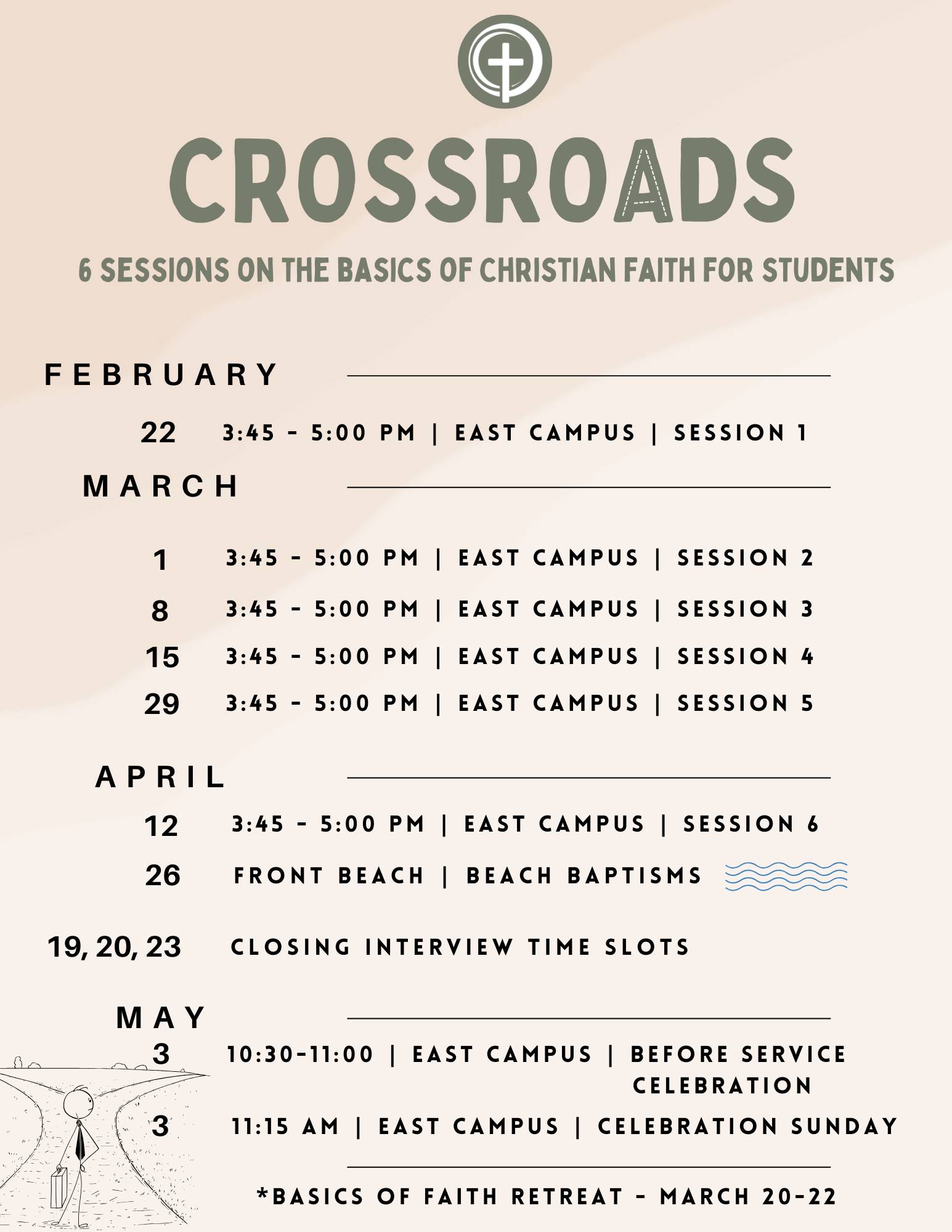 Crossroads is an adaptation of the formerly known Confirmation process. Students in 5th and 6th grade have the opportunity to walk through 6 sessions of discovering the basics of their Christian Faith. Through their journey, they will come to understand their relationship with Jesus on a deeper level to prayerfully choosing salvation and baptism (or remembrance of their infant baptism).